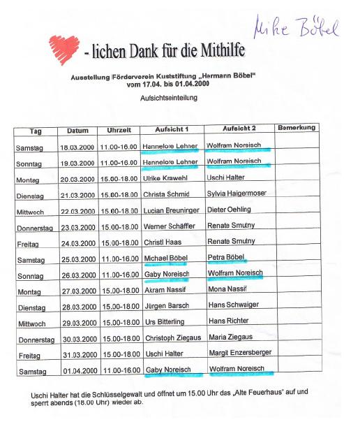 Besonderen Dank gilt Frau Christine Bucher die durch Ihre Vermittlung mit der Stadtteilbürgermeisterin Frau Ingeborg Staudenmeyer unserem Förderverein diese Gedächtnisausstellung zum 15. Todestages von Hermann Böbel im Trafo-Neuhausen ermöglicht hat. Herzlichen Dank an alle ehrenamtlichen Helfer!