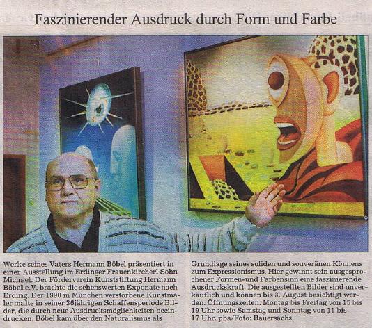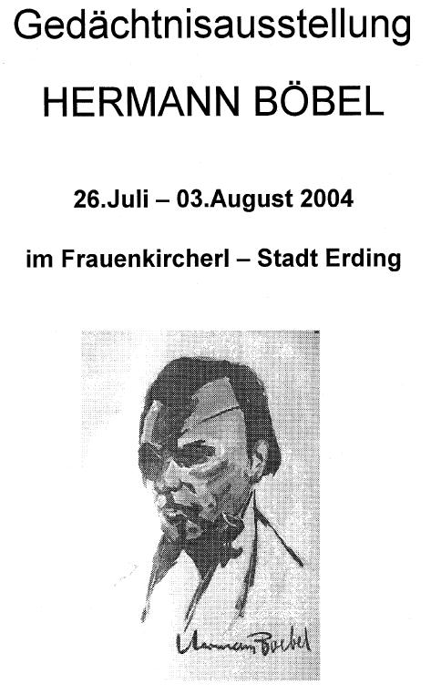 Besonderen Dank an den Kulturreferenten der Stadt Landshut Herrn Stix und unserem Mitglied Frau Karin Lehner, die durch ihre Vermittlung die Gedächtnisausstellung Hermann Böbel ermöglicht haben. Diese Gedächtnisausstellung wurde von mehr als dreitausend Besuchern gesehen. Eine Dankeschön an alle ehrenamtlichen Helfer! zurück zur Übersicht Gedächtnisausstellung im Frauenkircherl in Erding 2004